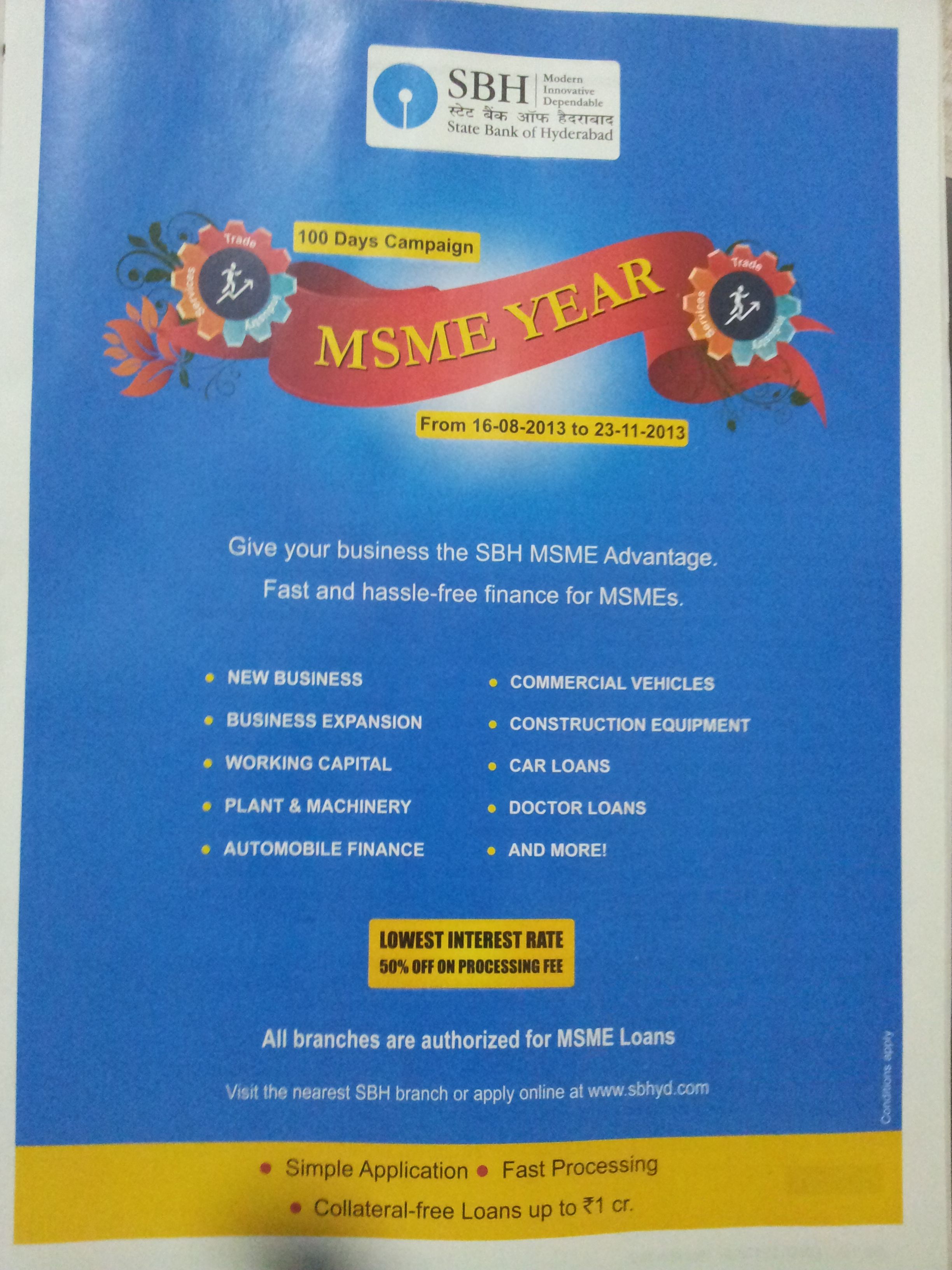State Bank of Hyderabad is having a 100 days’ campaign for MSMEs – 16 August to 23 November 2013 with lowest interest rates, 50% off on processing fees, collateral free loans upto Rs. 1 Crore, and much more.