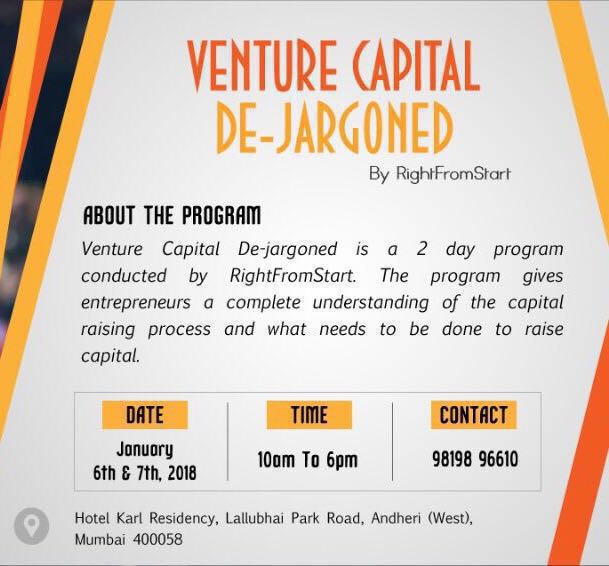 VC Dejargoned is a 2 day program giving entrepreneurs a complete understanding of the capital raising process. Be it preparation of business plan, pitching, valuation, due-diligence or termsheet; this program is aimed at giving entrepreneurs a holistic understanding of how to raise capital. No high level gyaan, but a power packed knowledge series designed by entrepreneurs, investors and investment bankers. Date: 7th and 8th January 2018 Venue: Hotel Karl Residency, Lallubhai Park Road, Andheri (West) For detailed content and registrations, visit http://www.vcdejargoned.com or call on 9819577336. On registration, get a free membership to VCD Club that will give entrepreneurs frequent opportunities to pitch to investors and get their feedback as well as interact with successful entrepreneurs to understand their capital raising journey.